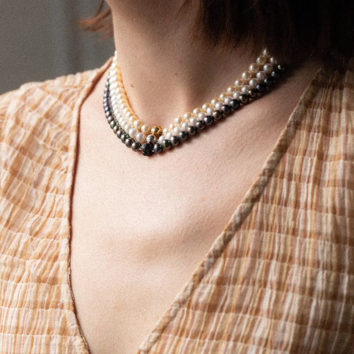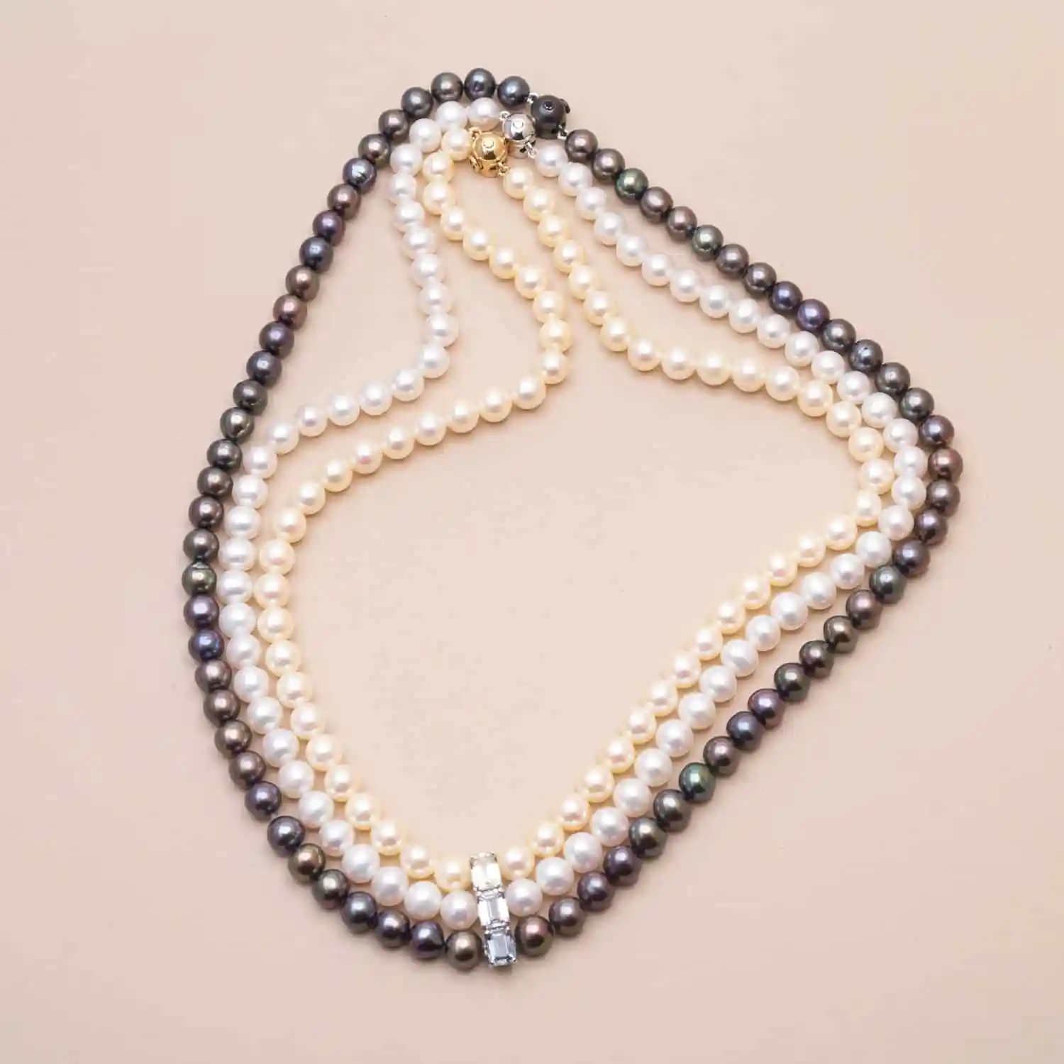 F L Création – Collier composé de trois rangs de perles de culture parfaitement appairées, un rang de perles blanches de type Akoya, un autre de perles lustrées vers le jaune et le troisième de perles noires des mers du sud