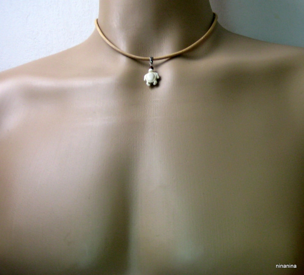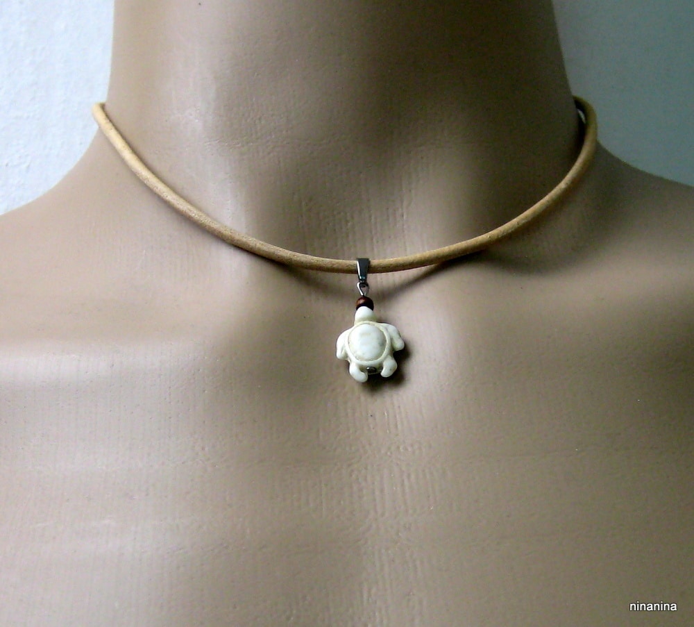 Collier cordon cuir composé d’une petite tortue blanc cassé montée sur un lien de cuir marron chocolat (3mm de diamètre). Dim de la breloque : 1,6 X 2 cm. Fermoir cylindrique en acier inoxydable. Longueur totale (fermoir compris): 44 cm env. Livré dans sa pochette d’organza. Bijou 100% fait main.