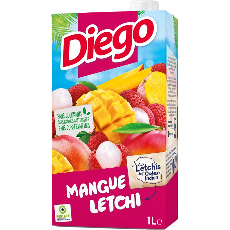 Boisson multifruits à base de jus concentré et de jus, aromatisée, saveur mangue letchi. Teneur en fruits : 30 %. Sans Colorants – Sans Arômes Artificiels – Sans Conservateurs.