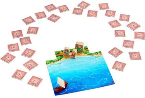 Dans Karuba Junior, le but du jeu est de tracer les chemins pour récupérer les 3 trésors avant que le bateau des pirates débarque sur l’île aux trésors.