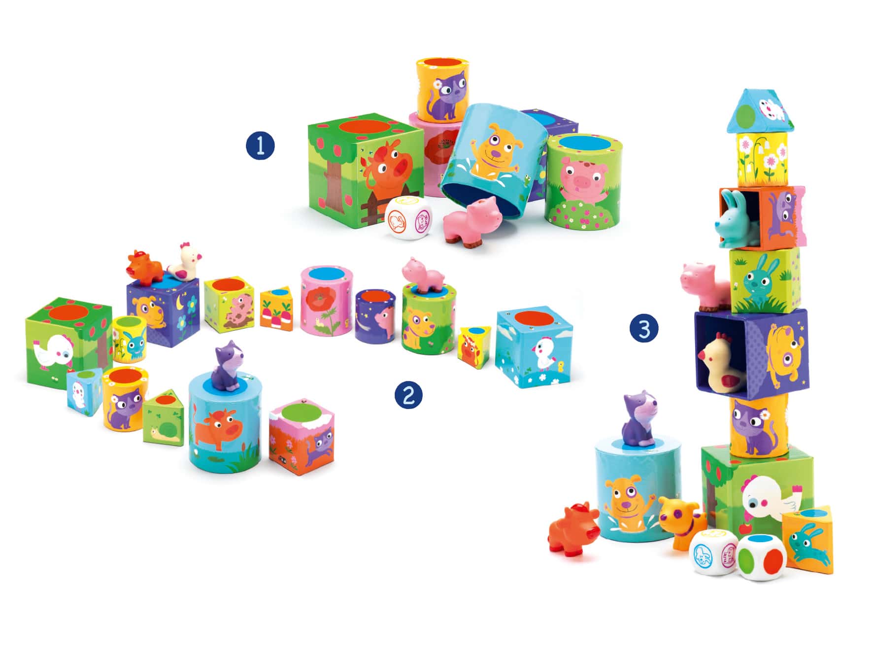 - Jeu 3: Badaboum des animaux. Le matériel est posé devant les joueurs à leur portée de main. Le gros cube « forme carrée » carré est posé au centre de l’espace de jeu. 2 modes de jeu sont proposées pour bâtir une pyramide. Le joueur qui fait tomber la pyramide perd la partie.